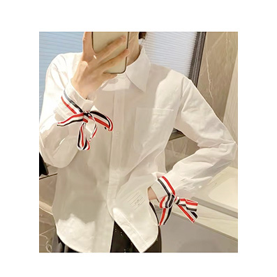 하이퀄리티 코튼소재의 컬러스트라이프 리본소매가 페미닌한 화이트셔츠에요.