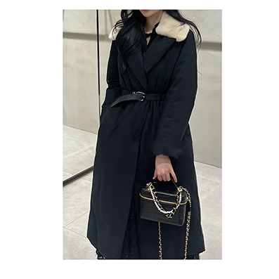 탄탄한 원단으로 핏이 예쁘게 딱 떨어지는 세련된 퍼카라,벨트가 있는 구스다운 롱코트에요.